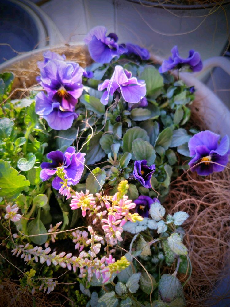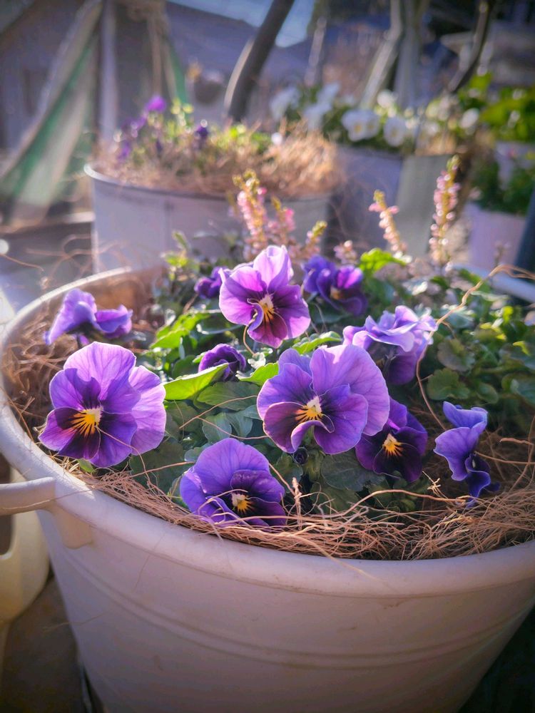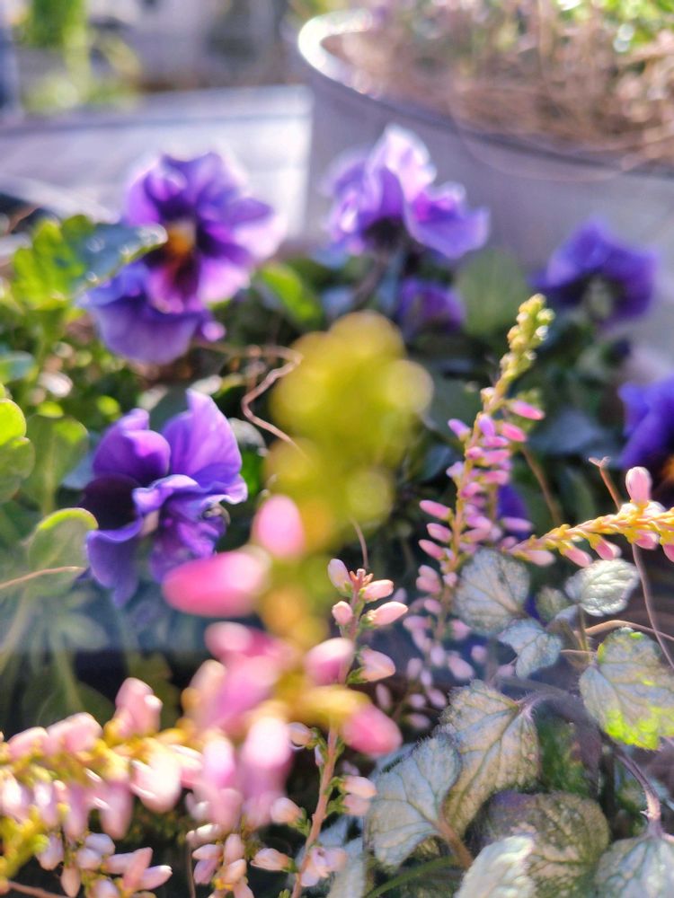 透明な光を浴びて☀キラキラしてるビオラさんたち。💜