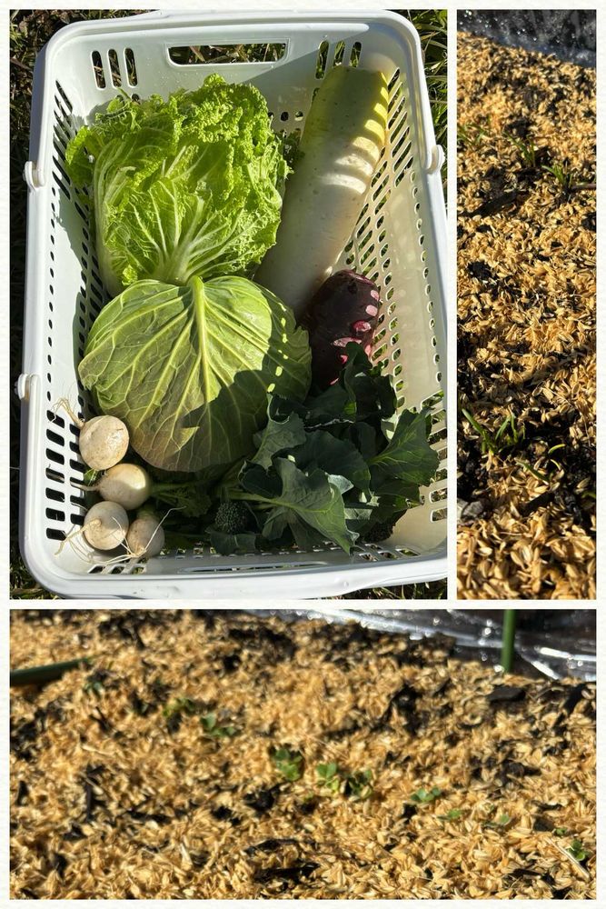 今日の収穫はキャベツ、白菜、大根、赤大根、小蕪、茎ブロッコリー