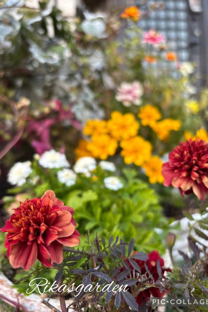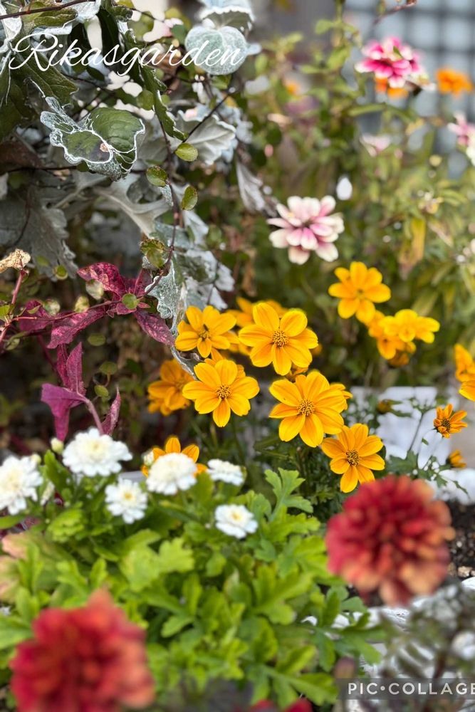 ②③その周りには、マリーゴルドやジニアがまだ頑張ってますが