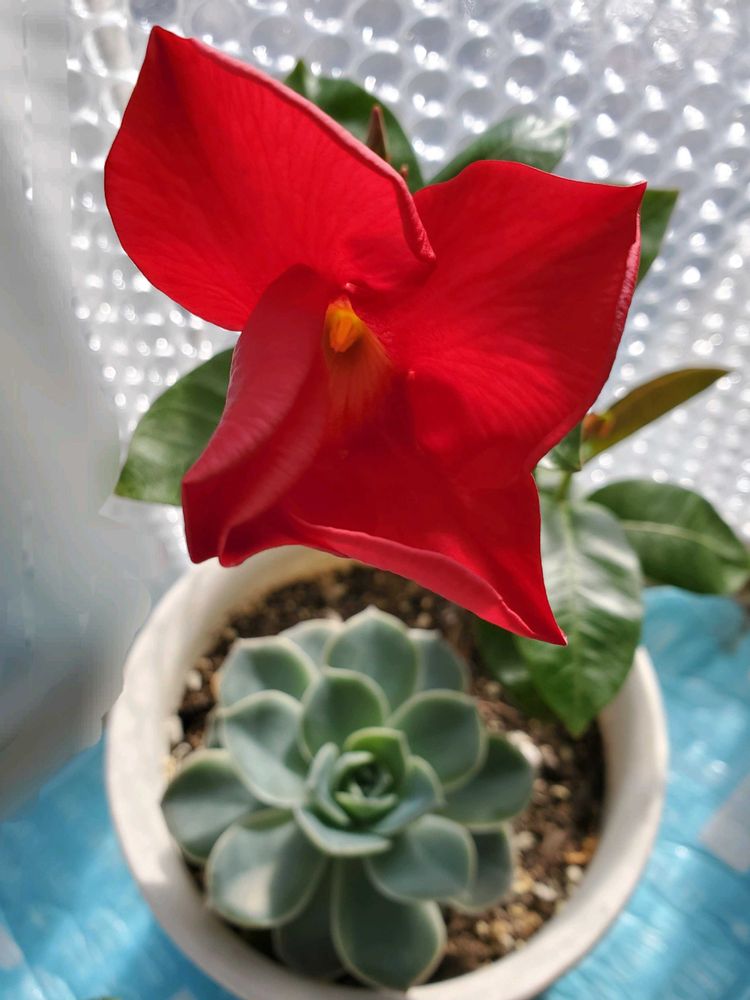 2️⃣挿し芽したマンデビラの花と、何故か同じ鉢のエケベリア