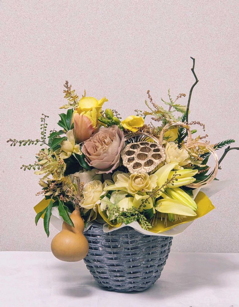 テーマカラーの金色、黄色いお花に瓢箪(六瓢息災神が宿る)、蓮の根 黄金長寿💛💛ブリザードフラワー😃これからも元気で仲良く過ごします💖🫠