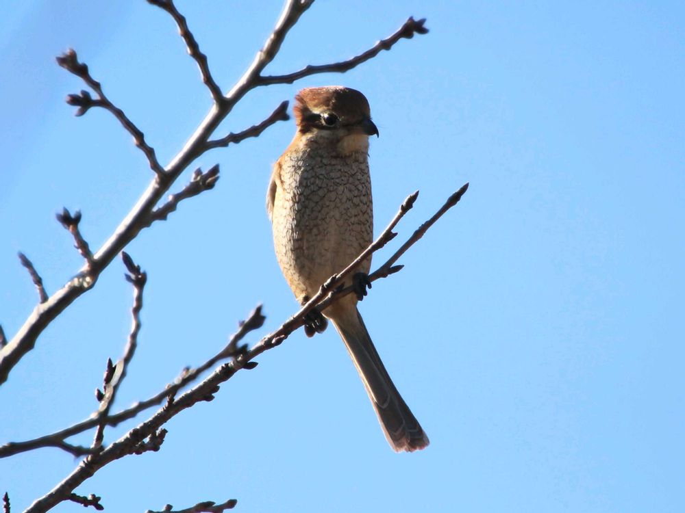 強風に髪逆立てているもず男と微動だにしないもず子(桜の木)