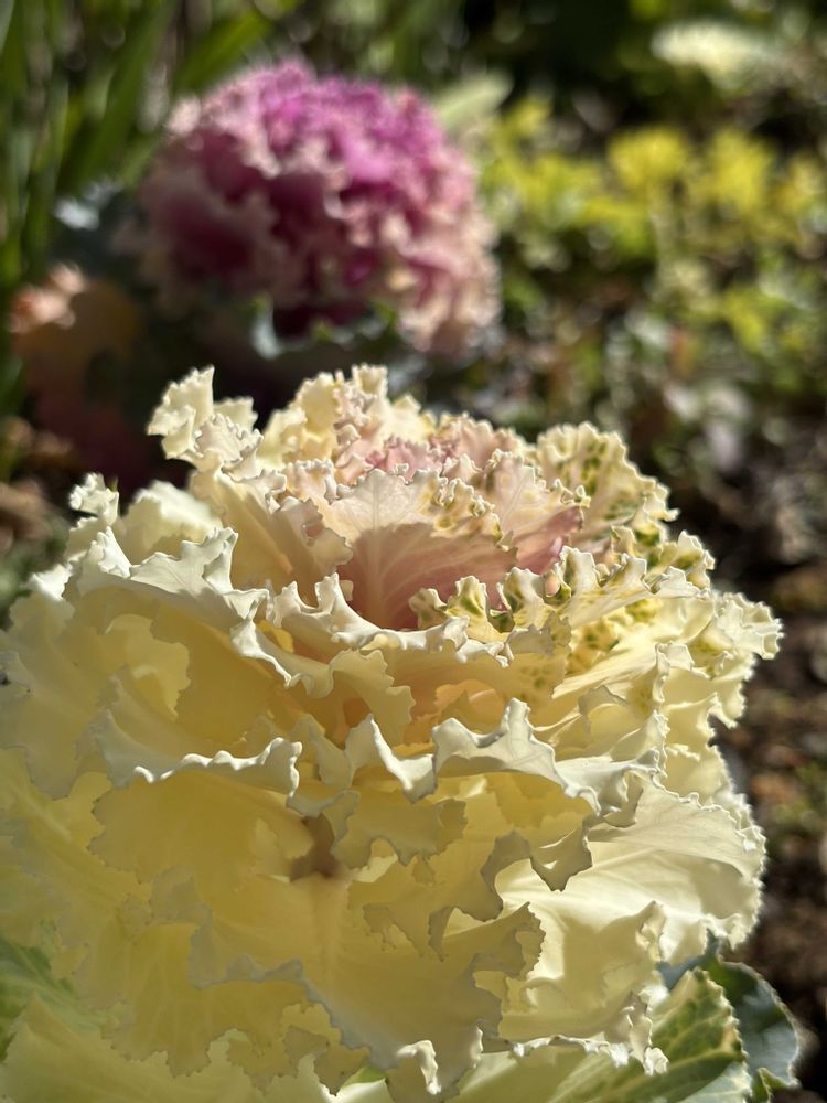 ③この冬、ハボタンを庭や鉢に植えました。今まではあまり植えなかったのですが、昨年はハボタンにモンシロチョウが卵を産んで青虫が育っていました。