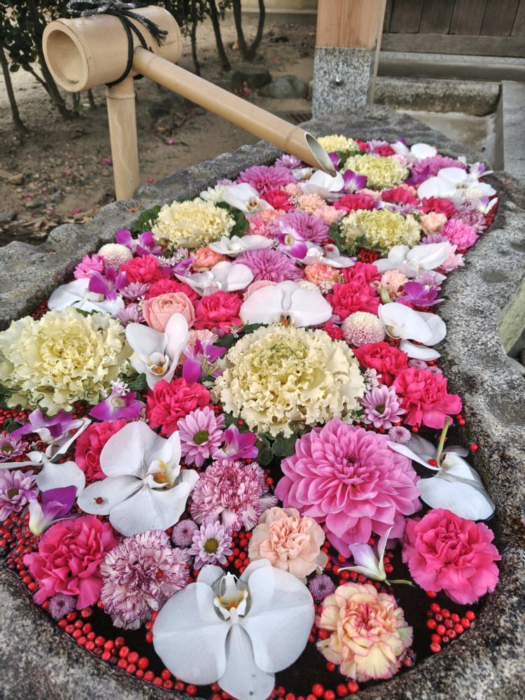 そんな雰囲気さえ感じさせてくれる、花手水のカラフルな彩りの世界に、思わず見惚れてしまうひとときです(^o^)v✌️