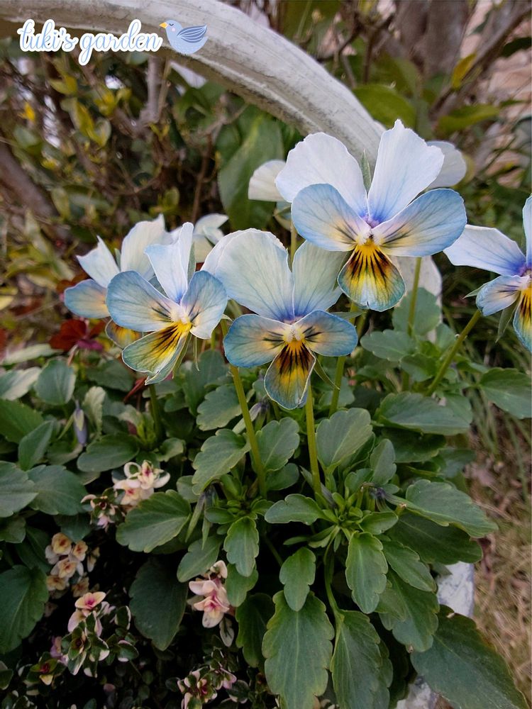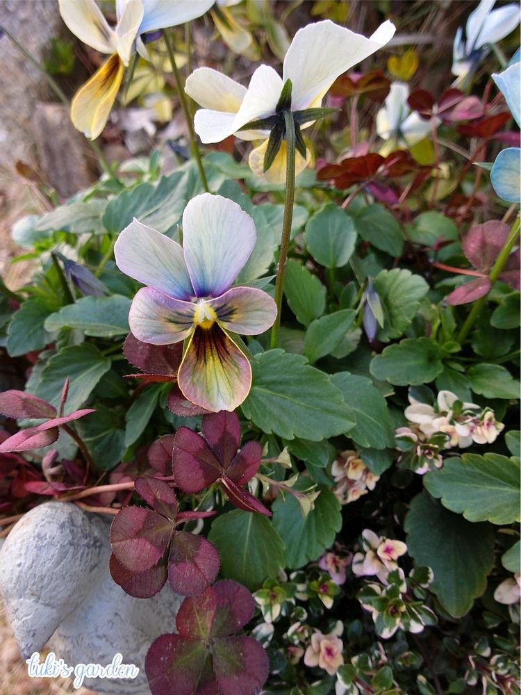 少しだけ色味の違う『すみれ図鑑』2株にシンプルにエンジェルクローバー『レモンティ』とタイム『ドレスホワイト』を合わせてみました。