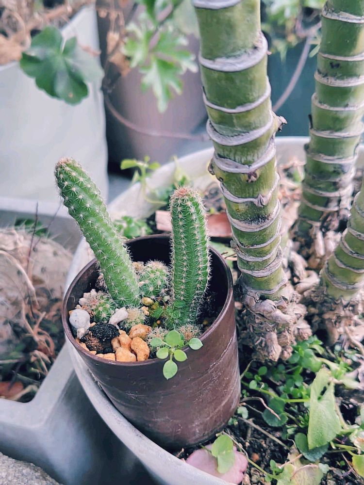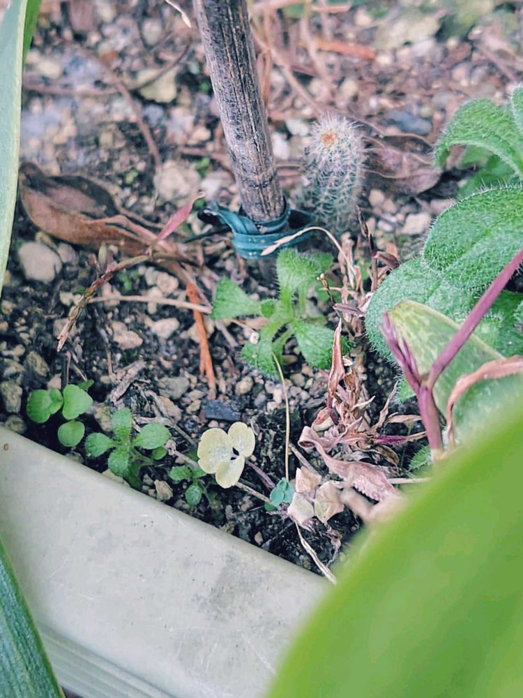 4枚目、松の鉢の足元。全然成長してない……置いた土(場所)が悪いからかな〜。気の毒なことをしてしまった。春が来たら他所へお引越し予定。