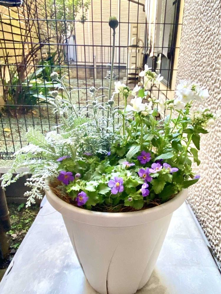 ローダンセマム エルフホワイトをベースにその右に白の宿根ネメシア、手前に紫のバコパ コピア、左端にレースフラワーを入れました🪴