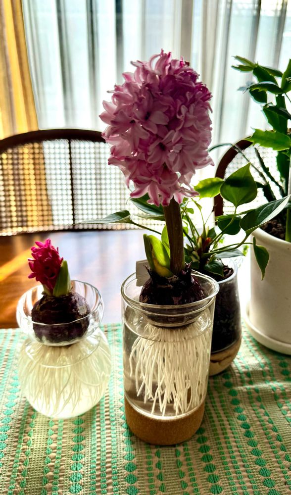 花の無い時期に、室内で手軽に楽しめるヒヤシンス様々です