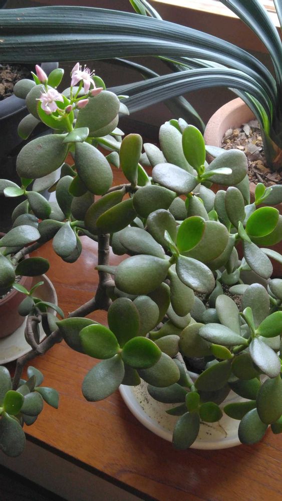 前に花が咲いたことのある金のなる木を冬の暖かないい天気の日に日向ぼっこさせて入れるの忘れたら少し雪が当たって😭