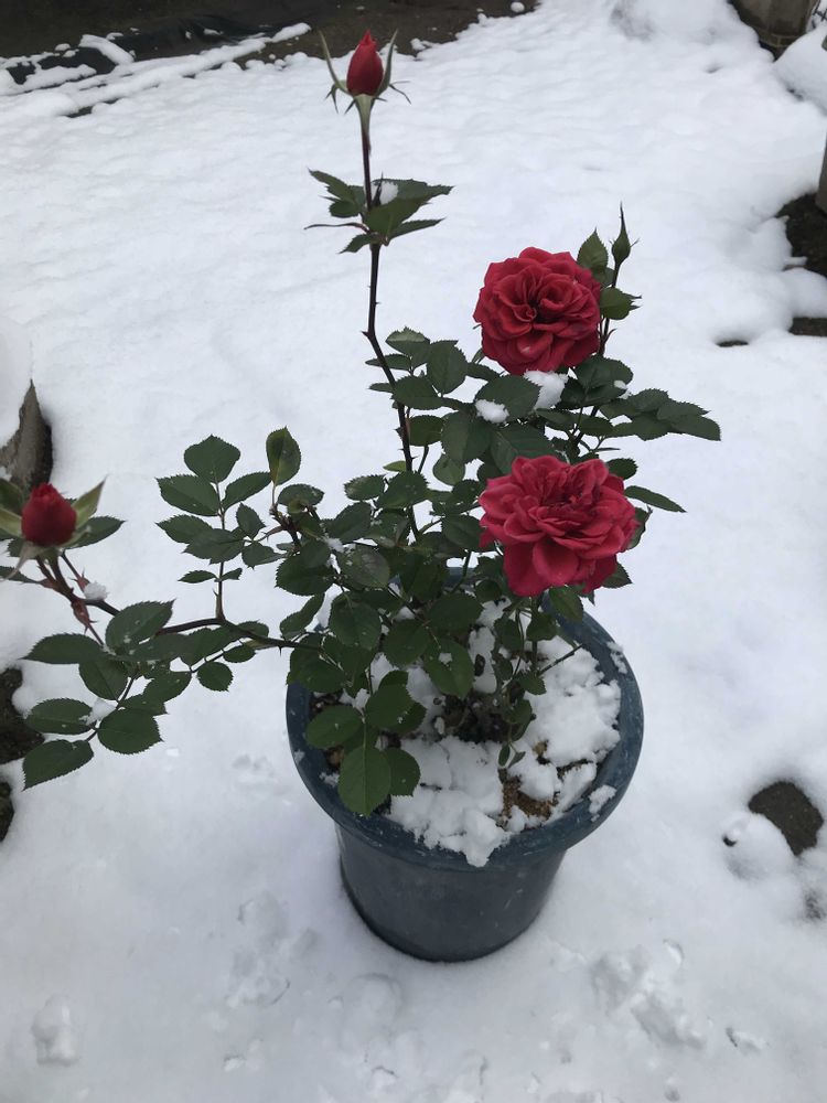 雪❄️☃️の中の薔薇🌹何度も登場しますが軒下に避難しましたが雪が吹き込んで白くなりました、どれくらい耐えられるのか朝出しました、蕾お花🌸も元気です^_^