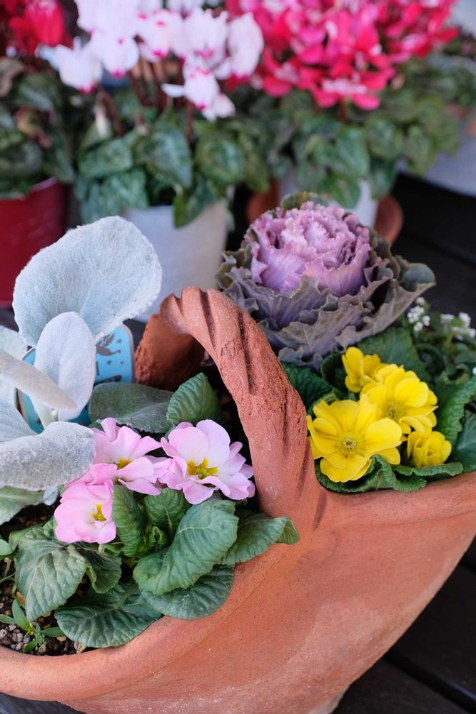 プリムラとエンジェルウィングスと葉牡丹とアリッサムの寄せ植え💕