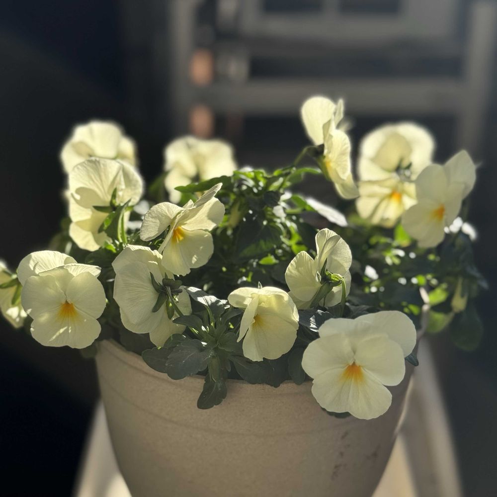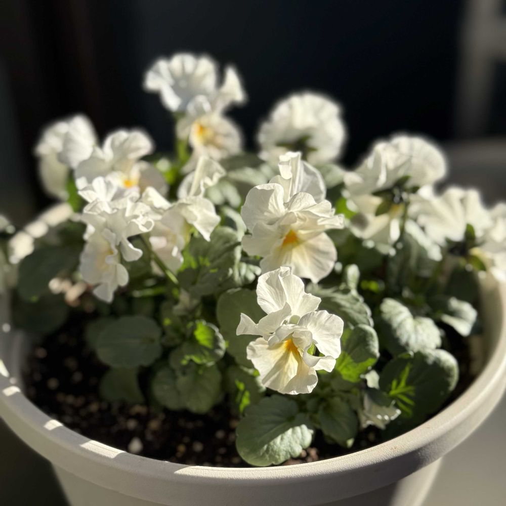 pic1 パンジー「シエルブリエ」。うっすら青みが出る花もありますが総じて白強めでベインも強く出過ぎず。何より花数が多いです