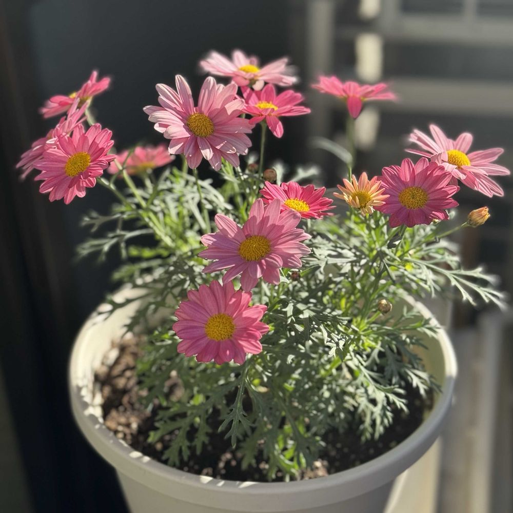 Pic1 PWマーガレット「シンプリーコーラル」。12月に入りお迎えした蕾のたくさんついた苗。夜お部屋に取り込んで朝出して、次々咲いてベランダが明るい雰囲気になってます。かわいすぎ😆
