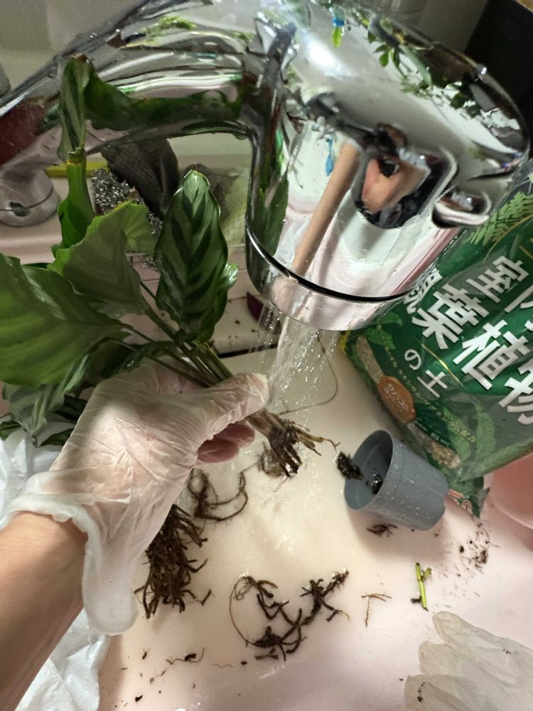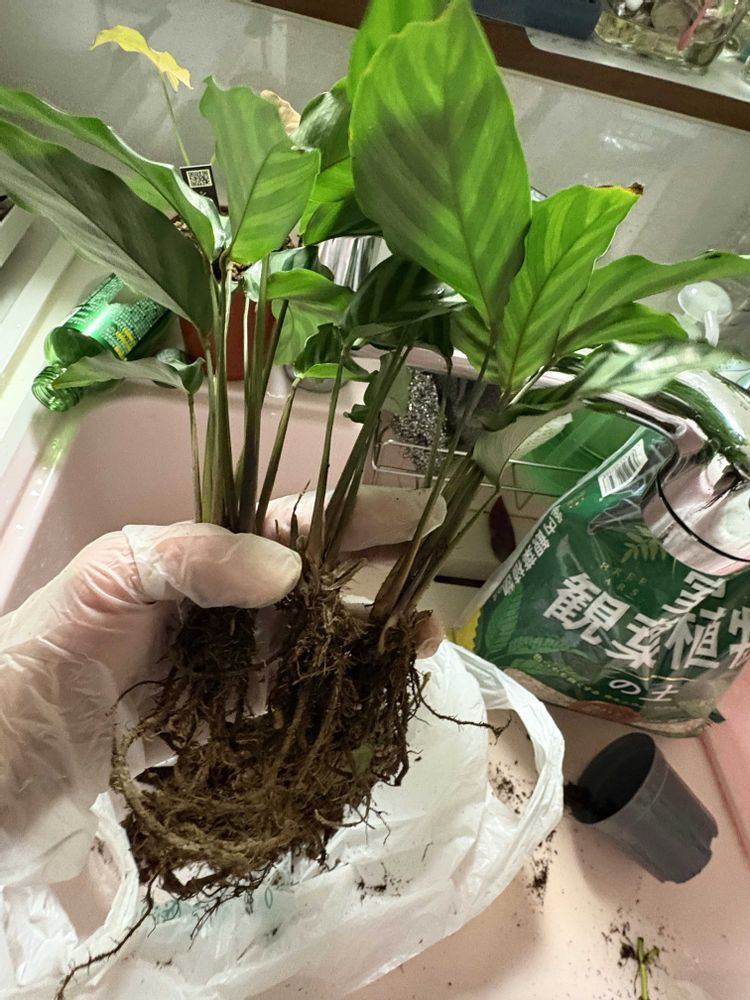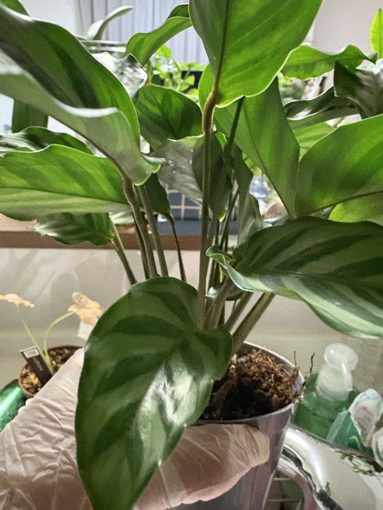 カラテア 🪴小さい鉢ですぐに水分無くなりカラカラ。葉っぱもすぐに丸まり枯れそうに🌿なるので植え替えました😊