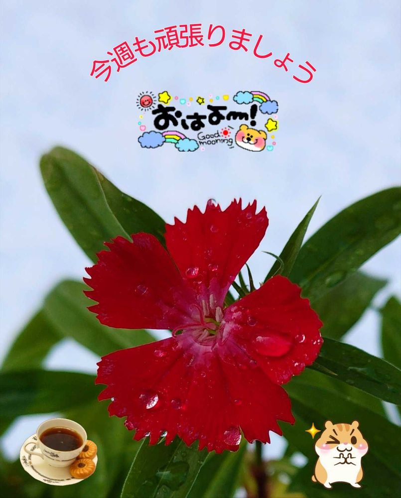 めめたん ^⸝⸝ᴗ ̫ o̴̶̷̤⸝⸝^さんのナデシコ,水滴,真っ赤な花の投稿画像