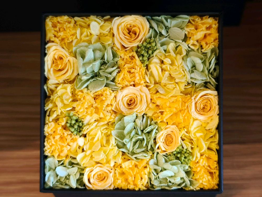 いろんな色を使ったフラワーボックスも華やかでいいですが、黄色系や青色系とかでそれぞれまとめたフラワーボックスも統一感あって素敵でした🥳