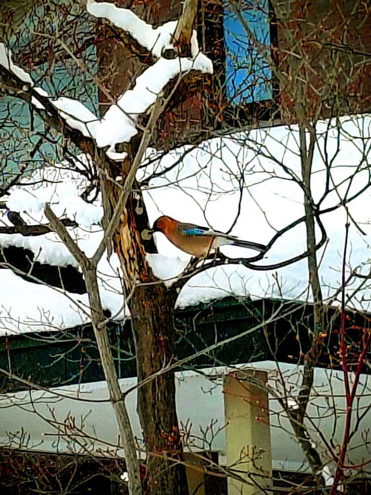 初詣と、どんと焼きをお願いしようと、神社へ向かう散歩途中にてカケス🐦