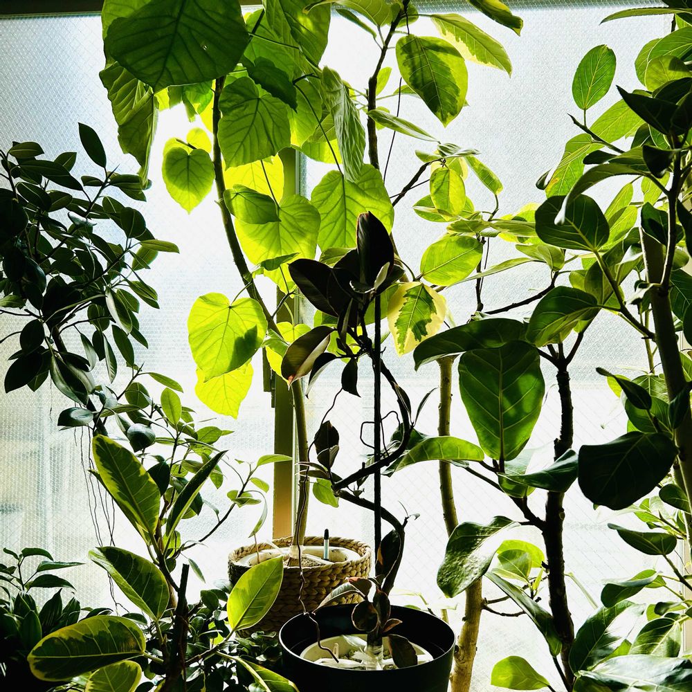 南窓際チーム😊今日はいい天気です☀️ゴムの木たち😊少し配置を変えました😊葉っぱのカタチや模様もそれぞれ個性的でおもしろいです〜😊幹は真っ白なベンガレンシスが好き💓😍です〜😊葉っぱはみんなどれも好き💓です〜