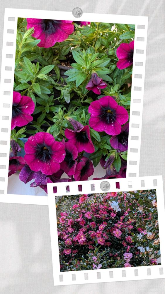 久しぶりに実家に行ったらお花いっぱいでした。カリブラコア?とサザンカ?イマイチ自信がないですが😅