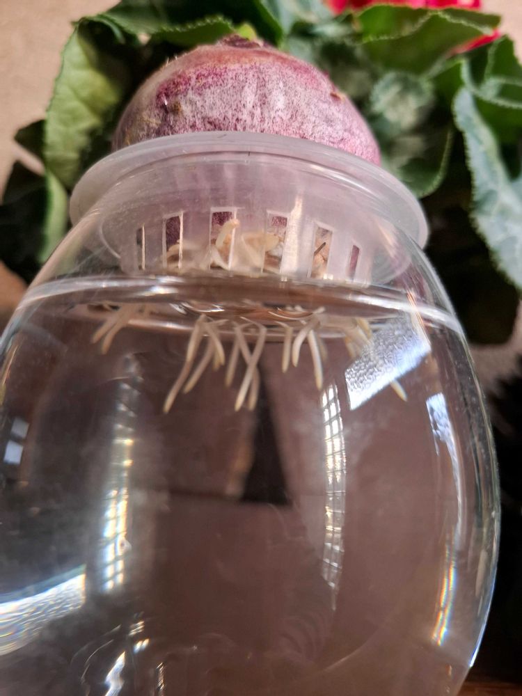 ヒヤシンス、根っこが出始めたところです😄