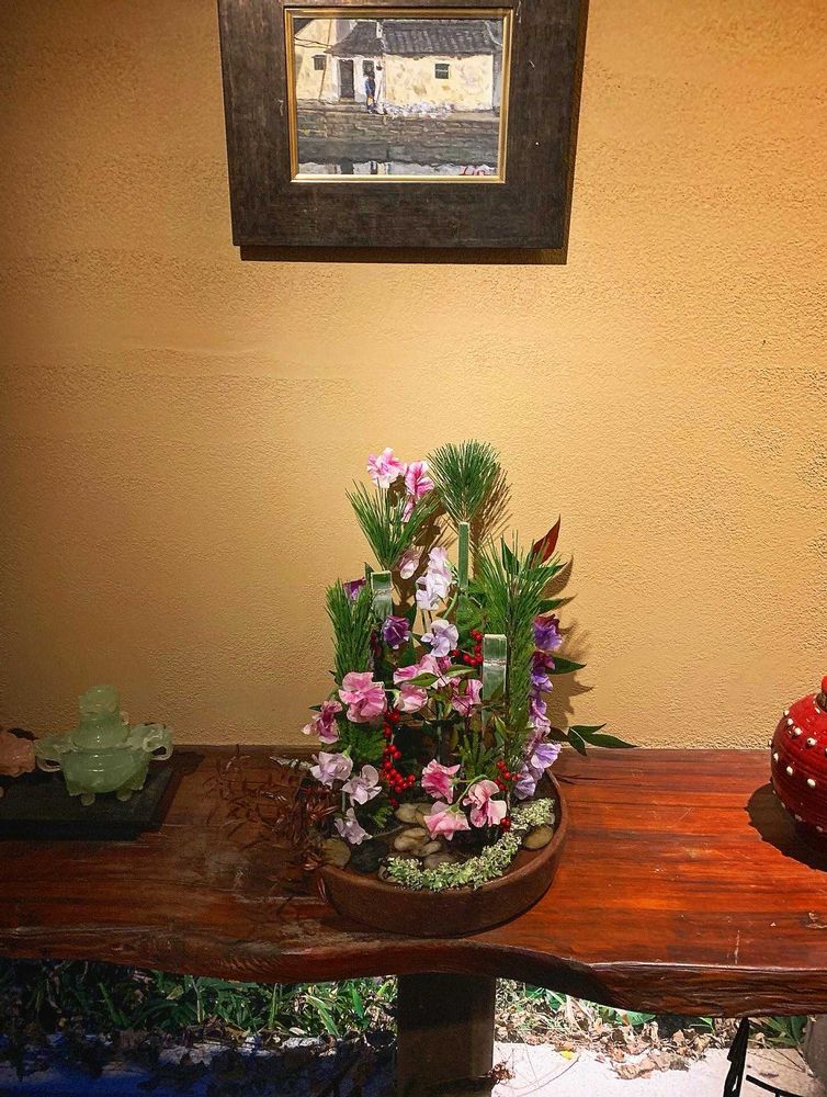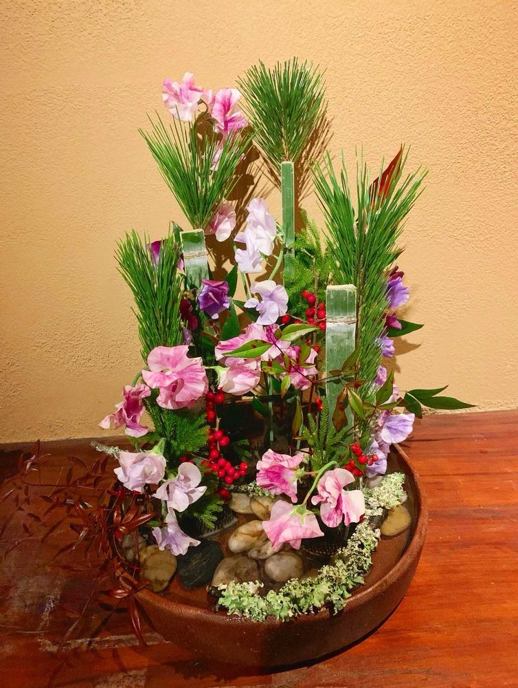 年末年始生け込み ドラゴンキッチン益城店様 お手洗付近の待合場所の為 色 香り共に楽しめるスイトピーを添えてみました。