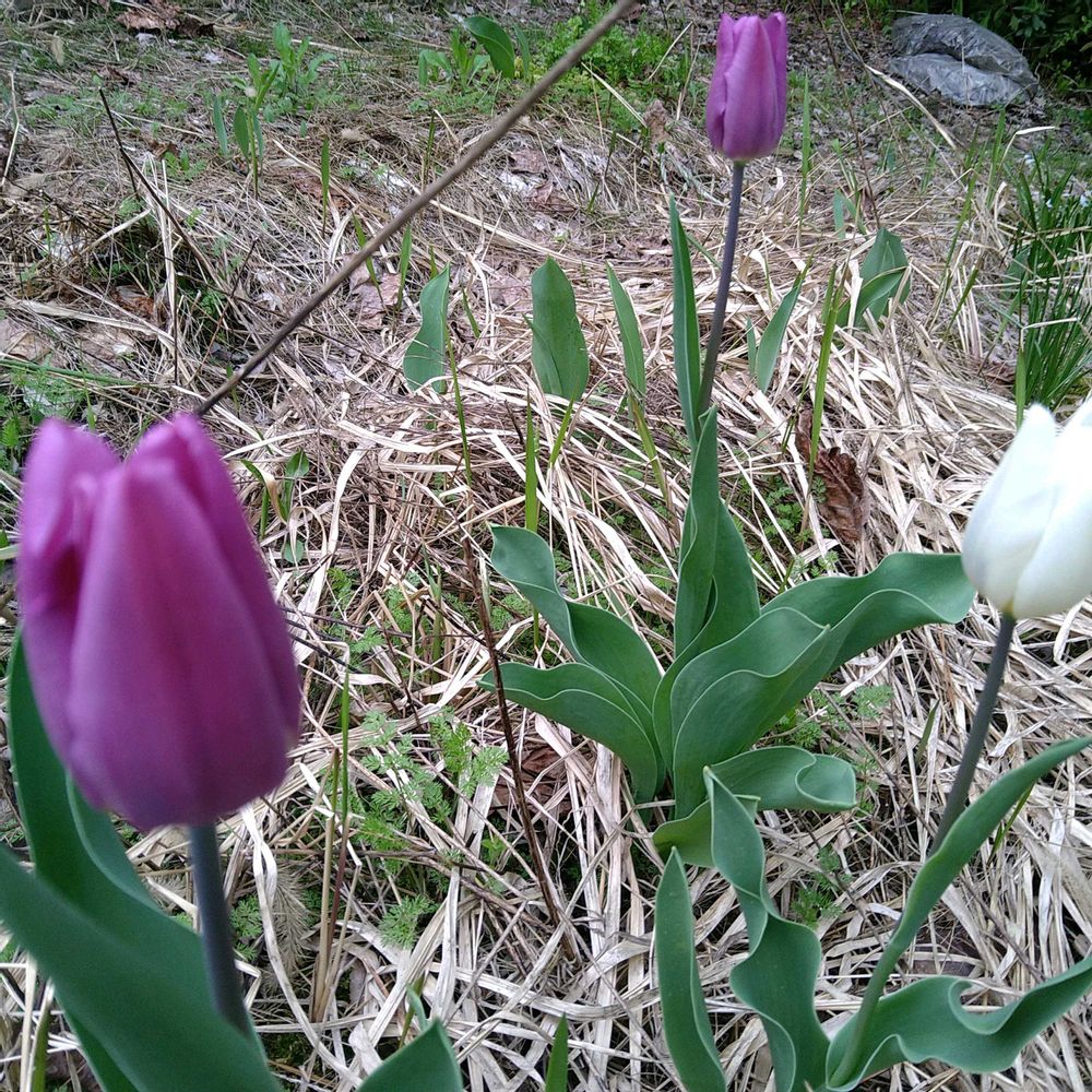 2024年に植えたミックスの球根から咲いた紫色と白さんチューリップ🌷