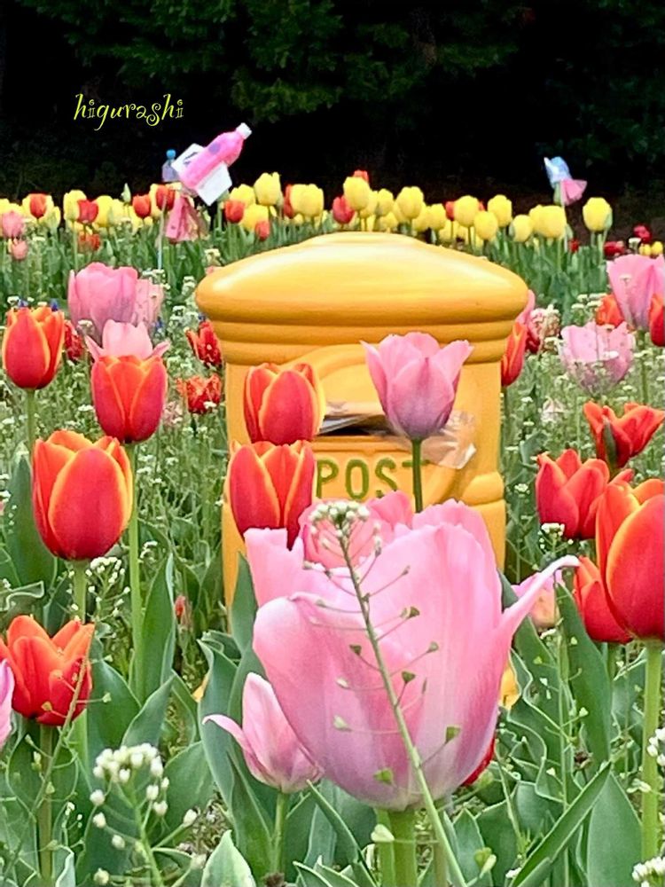 毎年、5万本のチューリップ🌷が迎えてくれます。一昨年は赤いポスト📮でしたー😊👍💞