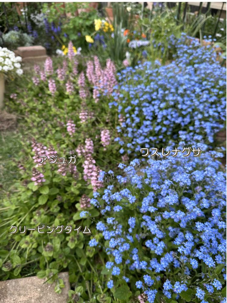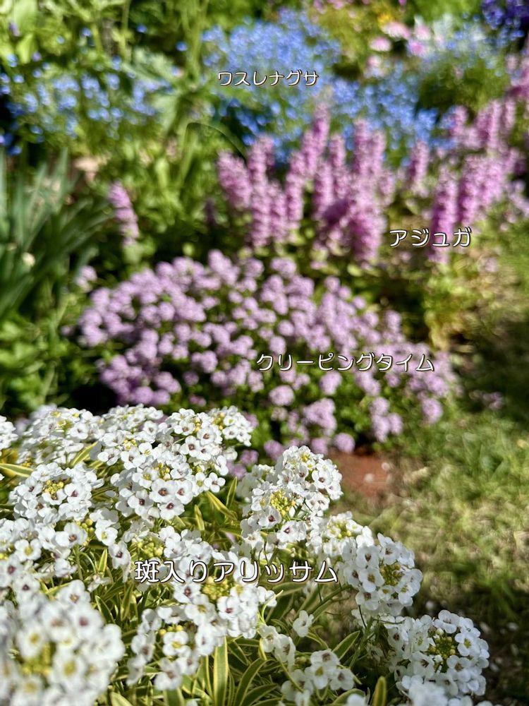 ❷〜❹ワスレナグサ、アジュガ、クリーピングタイム、斑入りアリッサム