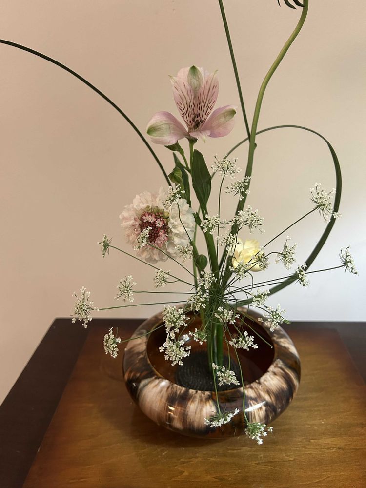 花材: スカビオサ、レースフラワー、リリーグラス、アルストロメリア、スプレー カーネーション