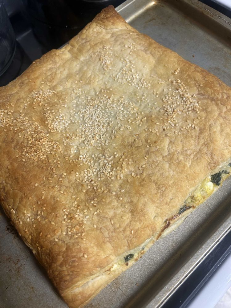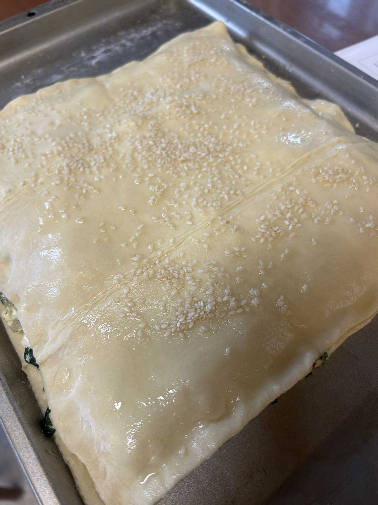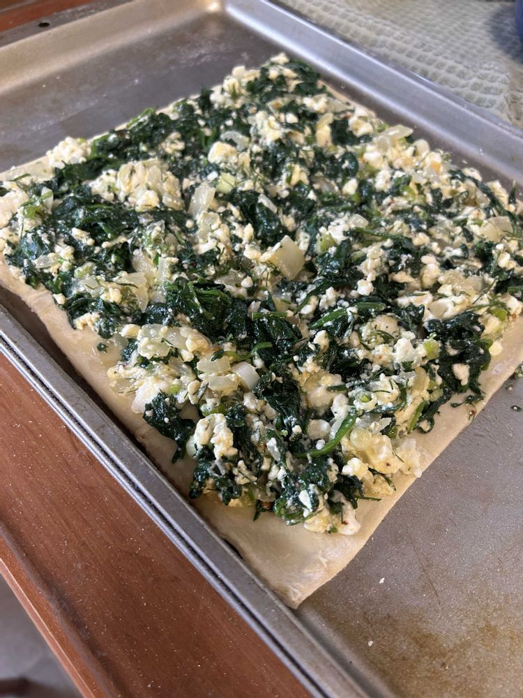 3、スパナコピタ。ほうれん草とフェタチーズをふんだんに使うので作り始めたところで、開けた箱のフィロ生地がフィロじゃなくて、パフペイストリーと判明😱