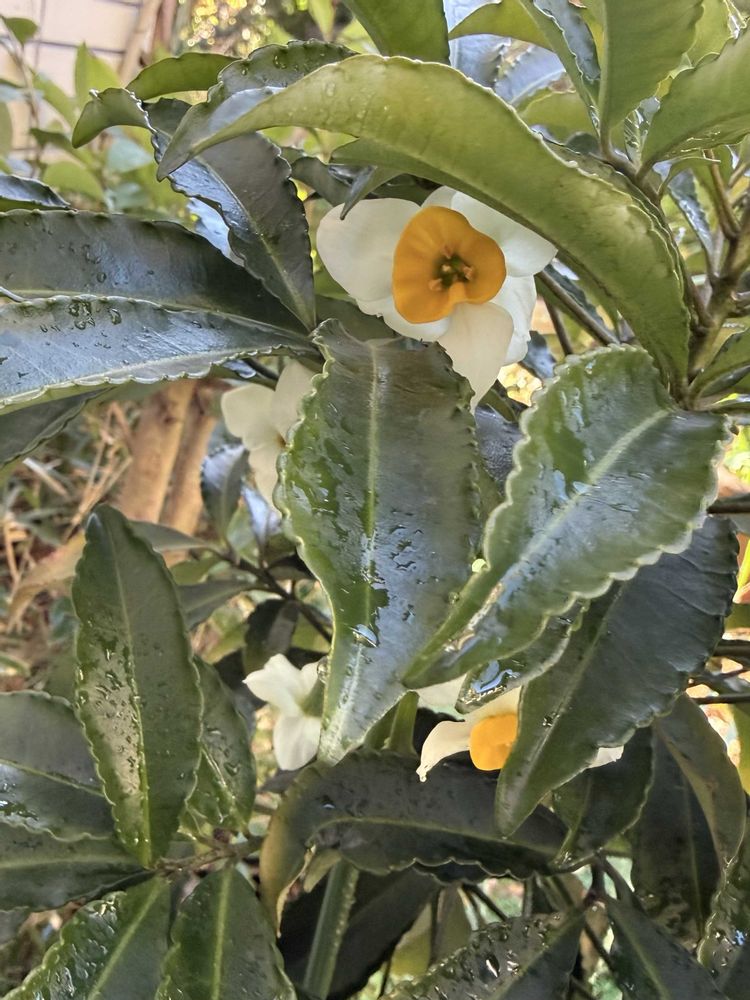 こんにちは。マンリョウの間から顔を覗かせているスイセン😆