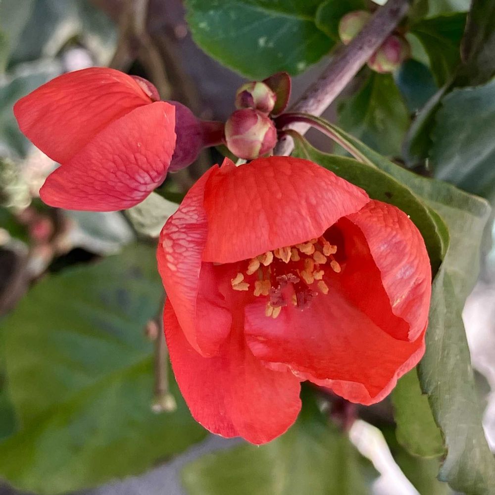 紅い木瓜(ボケ)の花。まるで、つくりものみたい、可愛ですね〜。