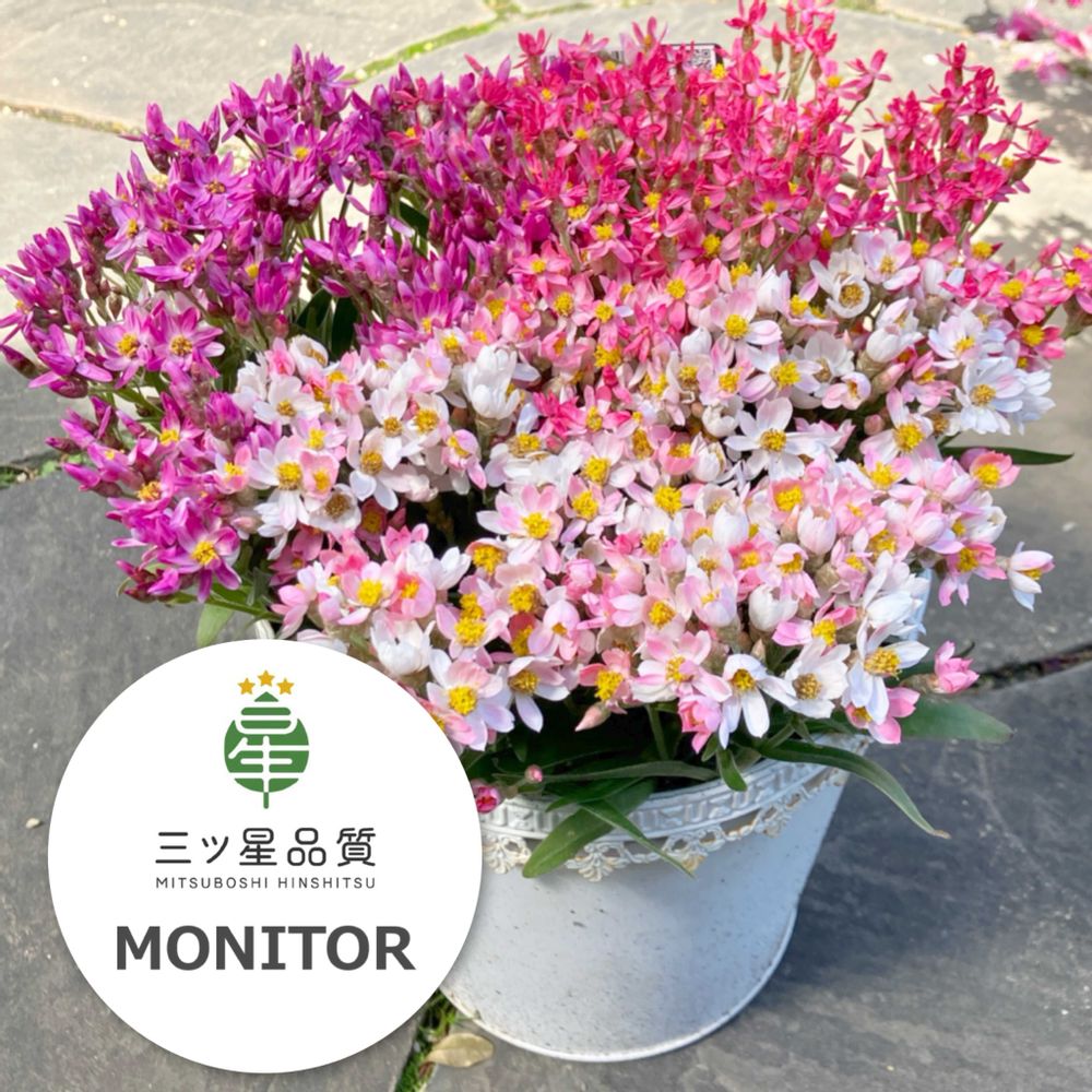 【三ツ星品質とは】 「三ツ星品質」は、ランダムに選ばれたモニターの皆さまが実際に苗を育て、その過程で「育てやすさ」や「花付きの良さ」など、さまざまな側面から一定以上の評価を得た苗に認定されるブランドです。 「三ツ星品質モニター」にご参加いただく方には、三ツ星品質に認定される前の苗を実際に育てていただき、その後、モニター期間終了時のアンケートで「生育面」「ビジュアル面」の項目について、星1~5の5段階でご評価いただきます。 そして、一定の基準以上の評価を得た商品は「三ツ星品質」として認定され、店頭に並ぶことになります。