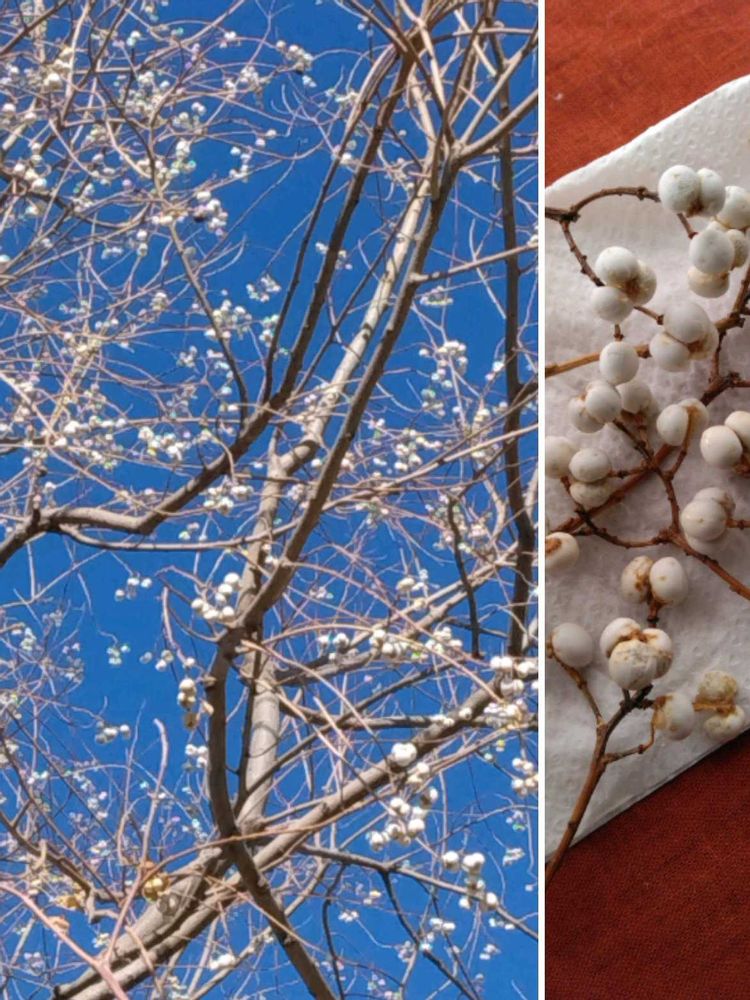 *白い花か、雪に見えるナンキンハゼが、まだまだ綺麗。下に落ちている白い実を拾ってきました。
