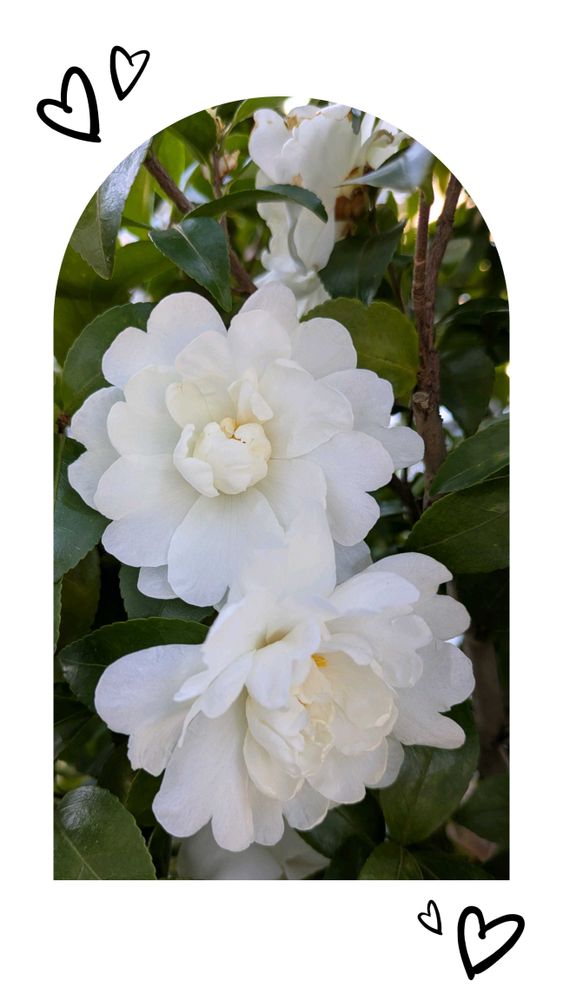 八重咲きサザンカ、豪華で清楚です。白はいいね😊