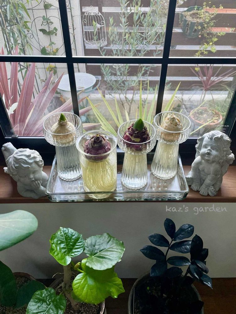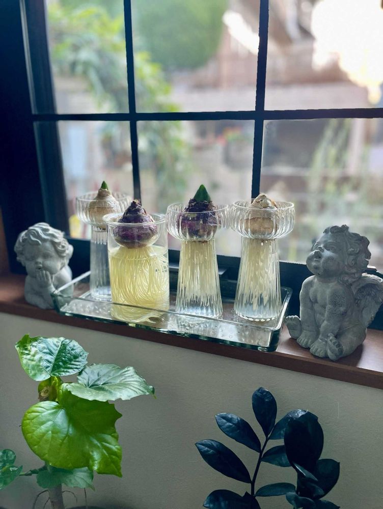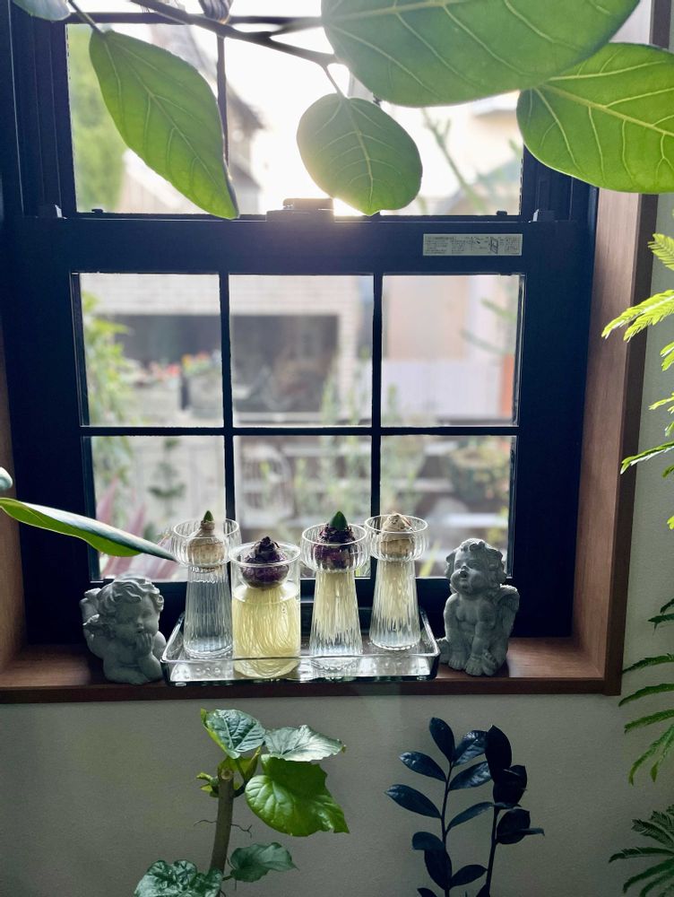 窓辺で、ヒアシンスが咲くのを見守っているようですネ~🤗👼