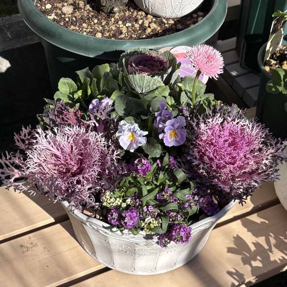 ①シックなピンクやパープルっぽい感じで、デージーやハボタン、アリッサム、中心はシエルブリエ です🥰