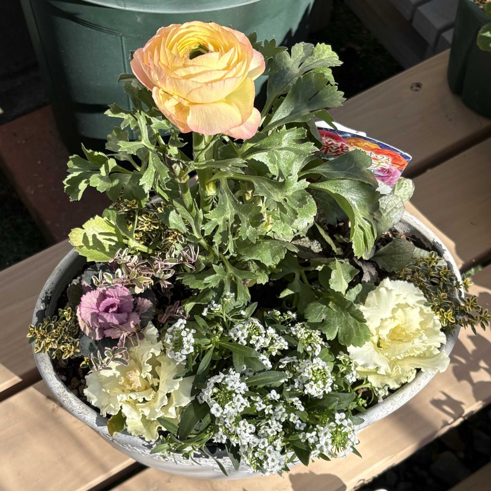 ③ 先週末に園芸店でお迎えしたラナンキュラス綾リッチ はクリハラガーデンさんから届いたお花を混ぜての寄せ植えにしてみました🥰