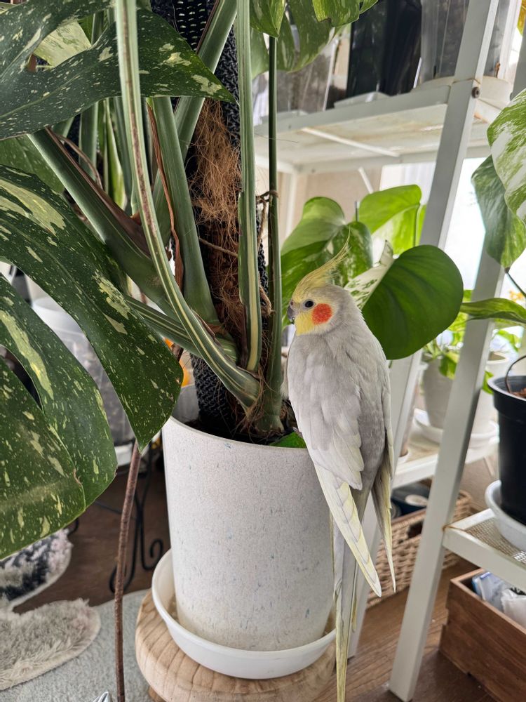 今年初のオカメちゃん❣️相変わらず可愛いですね😍モンステラの鉢で寝そうになってる姿も可愛すぎます😍😍オカメちゃんにとってお気に入りの場所なんですね🤭