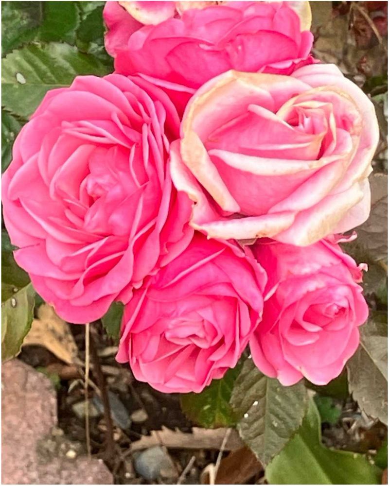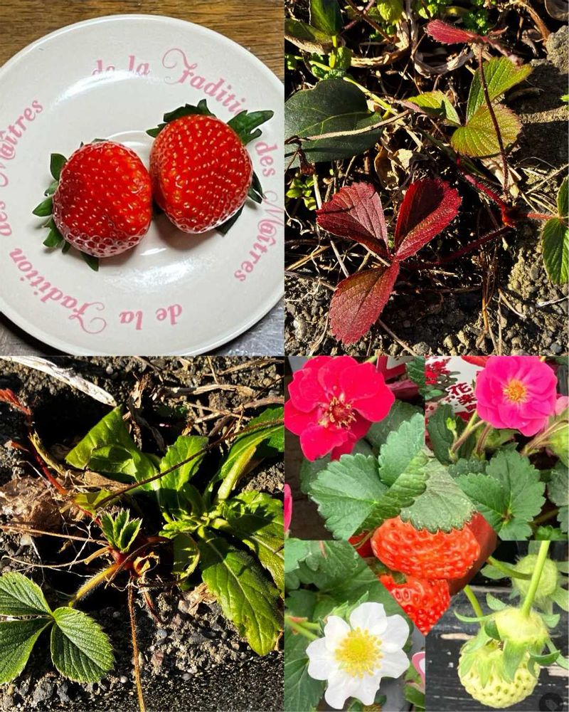 右上・左下、今の庭のイチゴ🍓の葉が赤く色づいてるのと新芽🌱が出て来た苗😉
