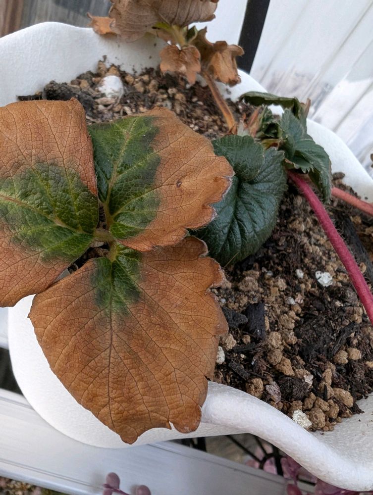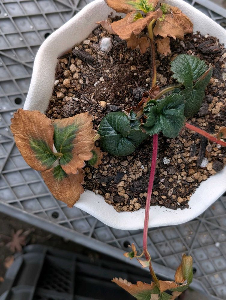 アレッ🥶イチゴの葉が様変わり〜〰️やはり外ではダメみたい