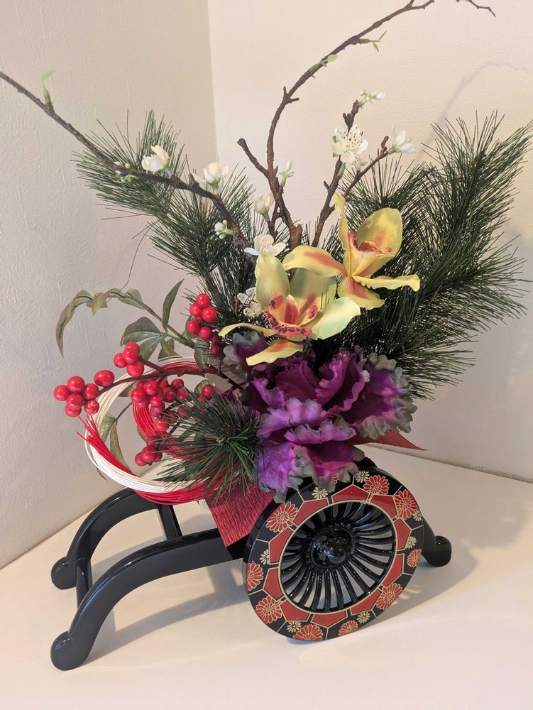 シンビジウム?、マツ、ウメ、ナンテン、ハボタン
