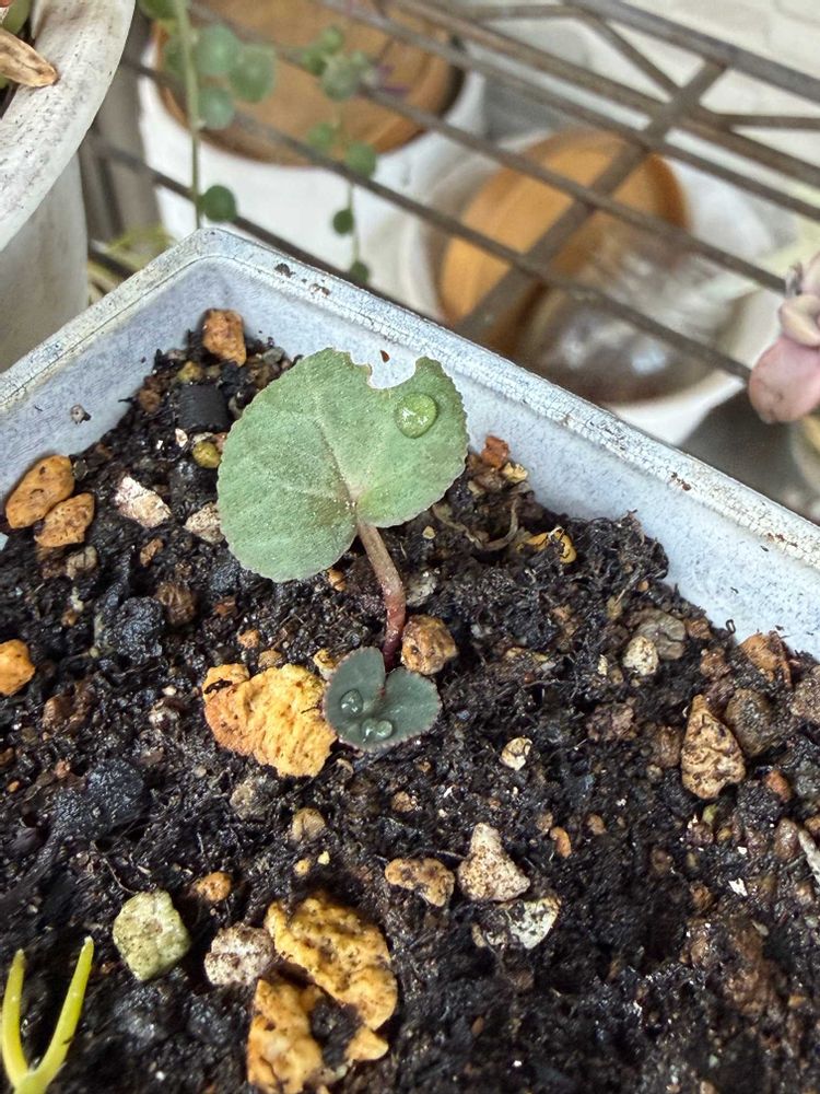 ガーデンシクラメンがいつの間にか種子から芽が出てた🌱なんかの虫にかじられてる👀このまま育つといいな🌸去年の夏に沢山あった親株達は夏の暑さで全滅してしまいました😲