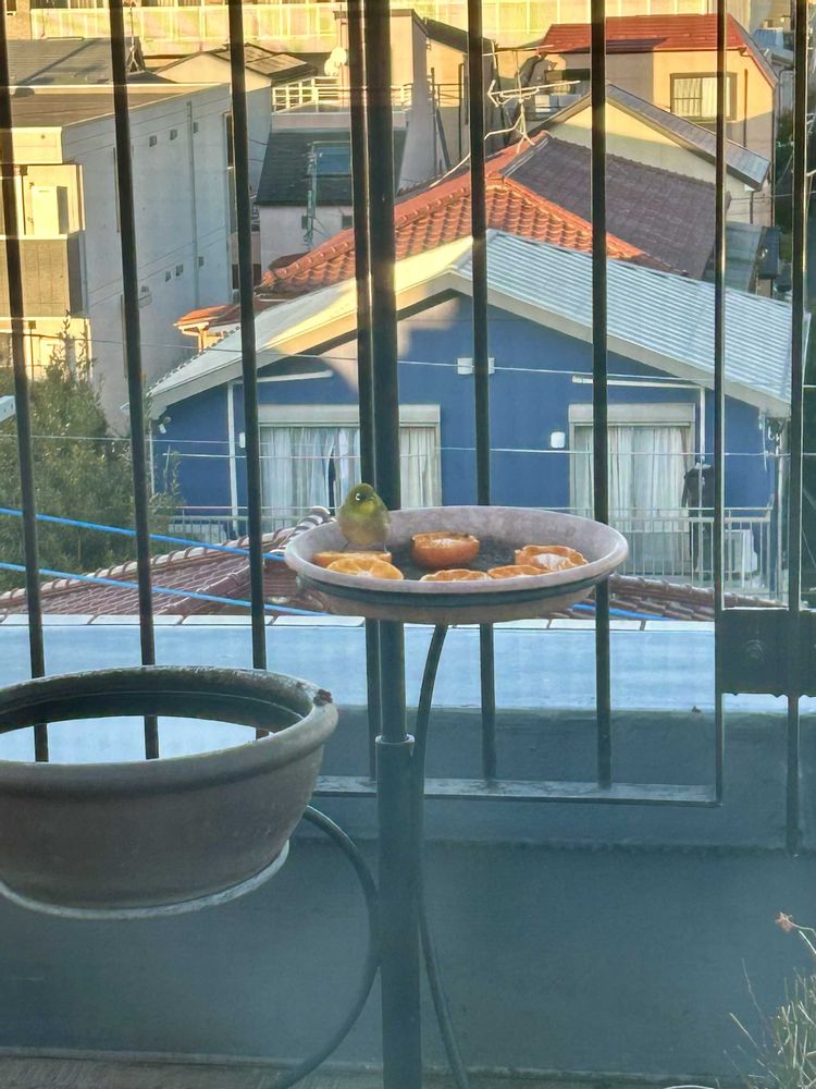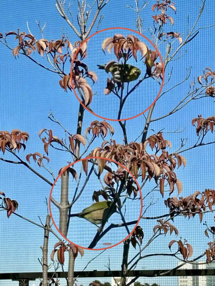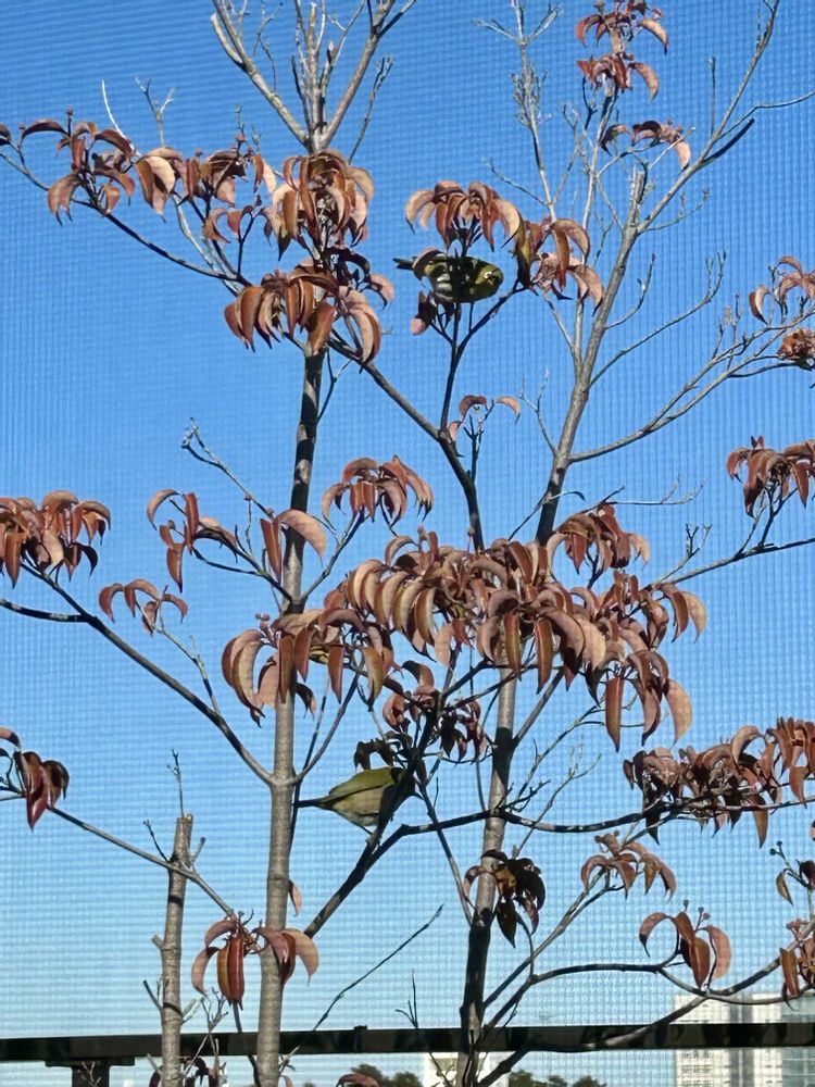 バルコニー小庭で小鳥さんの足場になっている常緑ヤマボウシ。強風吹き荒れる🌀悪環境で年々弱っていきます😢枝にメジロちゃんがつがい𓅫⸒⸒𓅫⸒⸒でやってきました❤️網戸フィルターがあると外からは見えないらしく近距離📸です