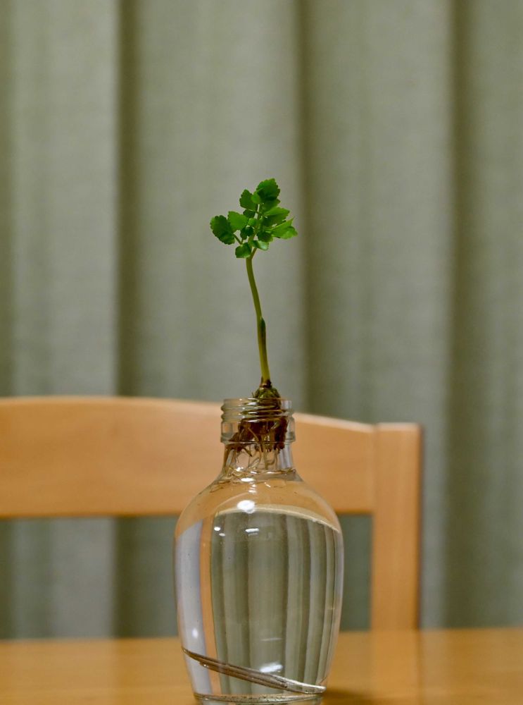七草粥セットに入っていたセリを食べずに成長の観察をしています🌱𓂃 𓈒𓏸新しい根がいくつか伸びて、葉っぱは増えて背が高くなりました🌿🤗🌱𓂃 𓈒𓏸