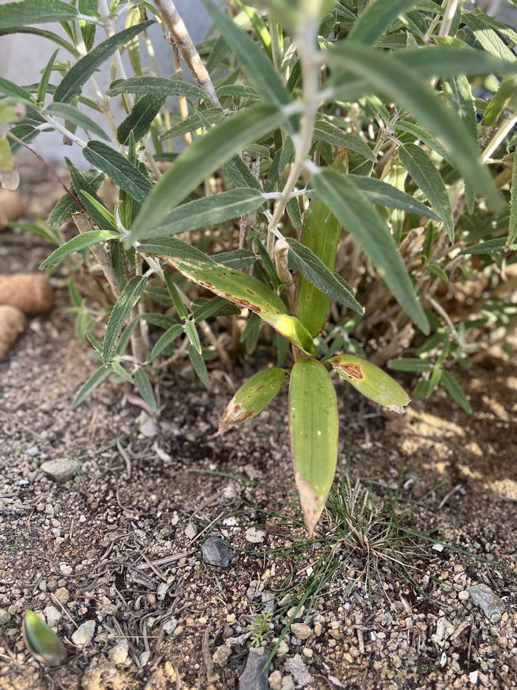 引越し祝いのブーケに入っていた赤縁の葉💐根が出たので地植えにしましたが、セージの勢いがすごくて押され、押されまだこんな感じ。頑張れー💓