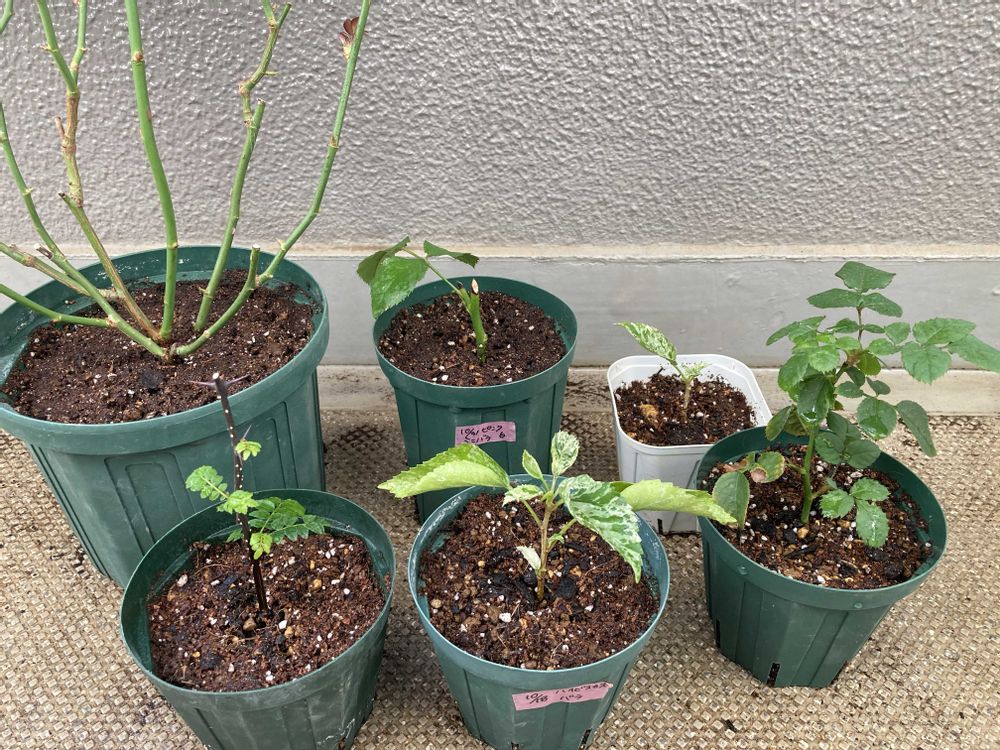 ラストの写真は挿し芽のバラとハイビスカスと山椒と…挿し芽から育てて3年目のバラを植え替えました