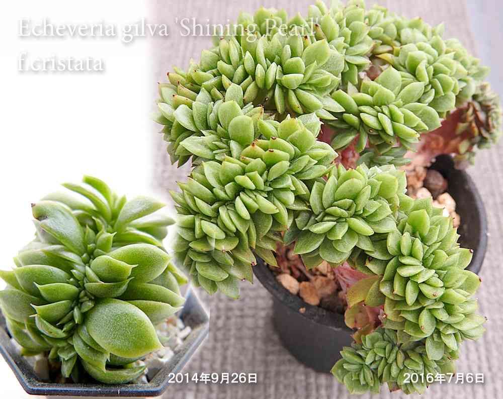 エケベリア、シャイニングパールの綴化。これは2014年にかったので2年選手。鉢を変えているので、縮尺が合っているかどうかわかりませんが、むちゃくちゃ大きくなりました。(葉っぱ一枚一枚は小ぶりになったかも)