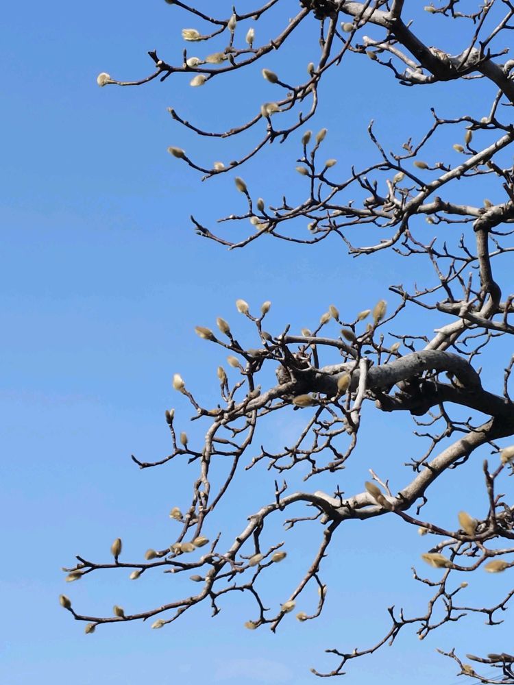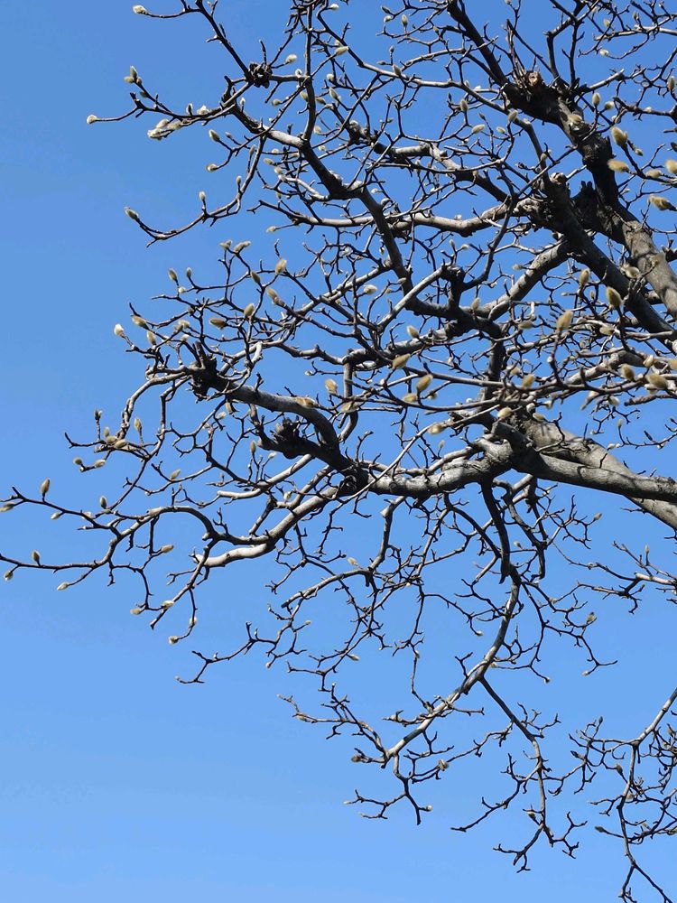 街のモクレンの並木道。この樹1本だけが蕾を膨らませている。枝の幾何学模様も美しい。寒波に蕾が負けませんように。