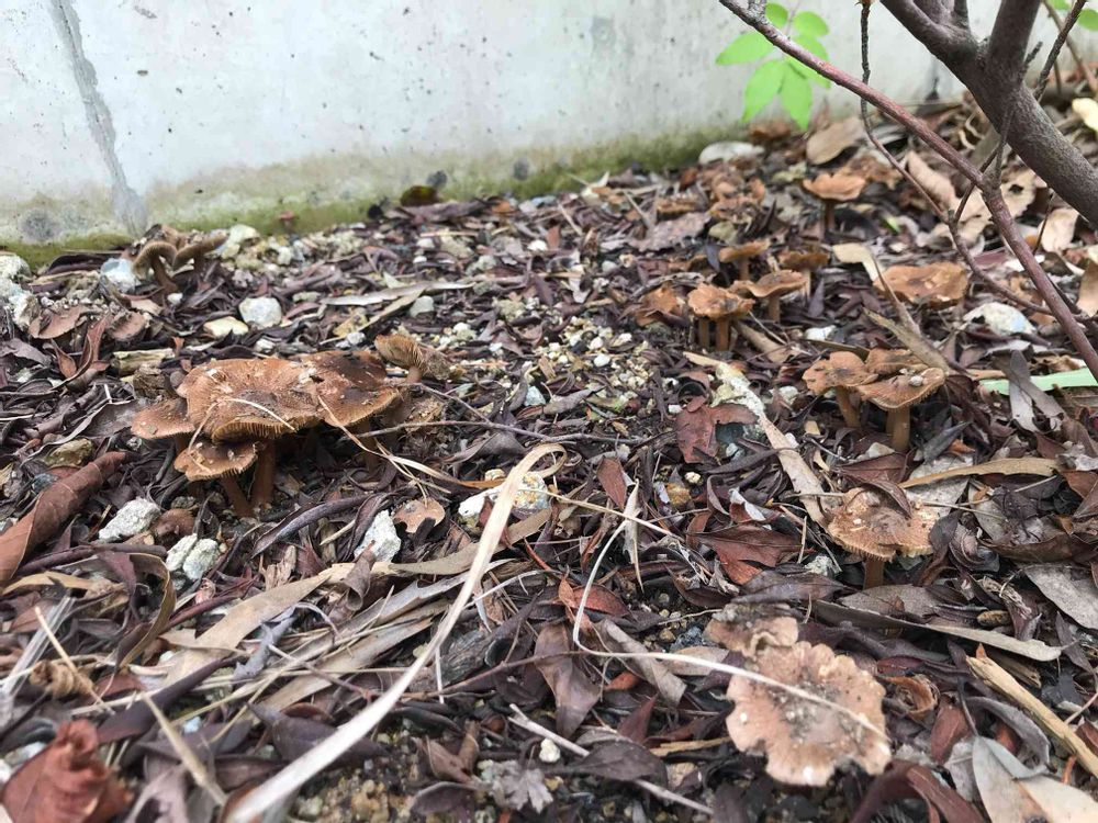 外構にある低木の株元にキノコが大量発生しました… これ、何て言うキノコかおしえて下さい🍄